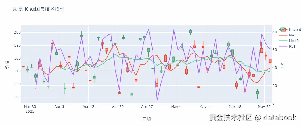 例如,移动平均线(MA)、MACD 和 RSI 等常用技术指标可以通过Plotly的add_trace方法叠加到K线图上。