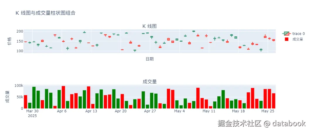 通过共享 x 轴,我们可以确保 K 线图和成交量柱状图在时间上保持一致。