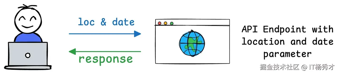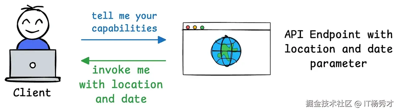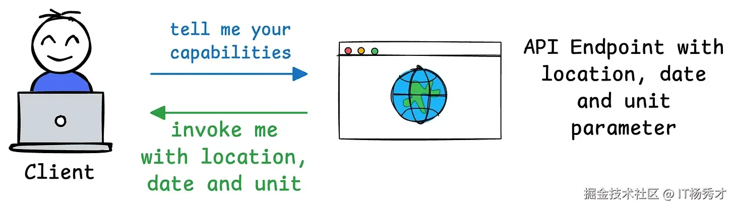 - 在传统的 API 服务中,如果你的 API Server最初需要两个参数(例如, location 和 date 用于天气服务),用户需要将他们的应用程序集成以发送带有这些确切参数的请求