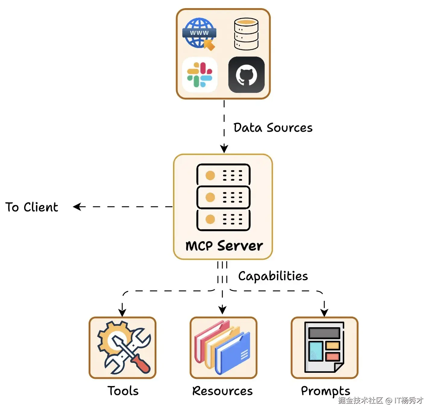 - 最后,MCP Server暴露特定的功能并提供数据访问,比如实时获取天气、浏览网页等等能力
