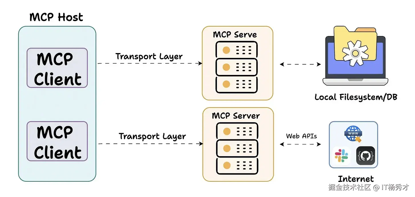 MCP 是基于客户端-服务器的架构,架构图如下所示:
