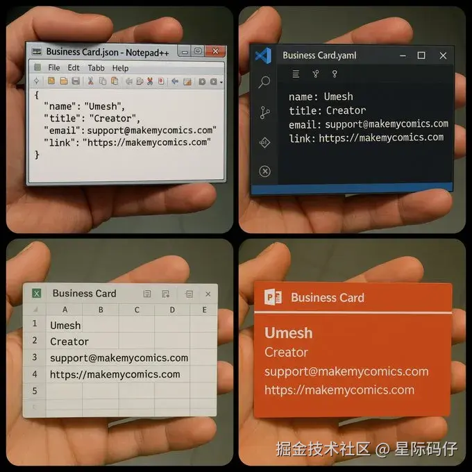我们可以在这个提示词的基础上,进一步拓展创意边界,比如改成Notepad++名片、PPT名片、Excel名片等。