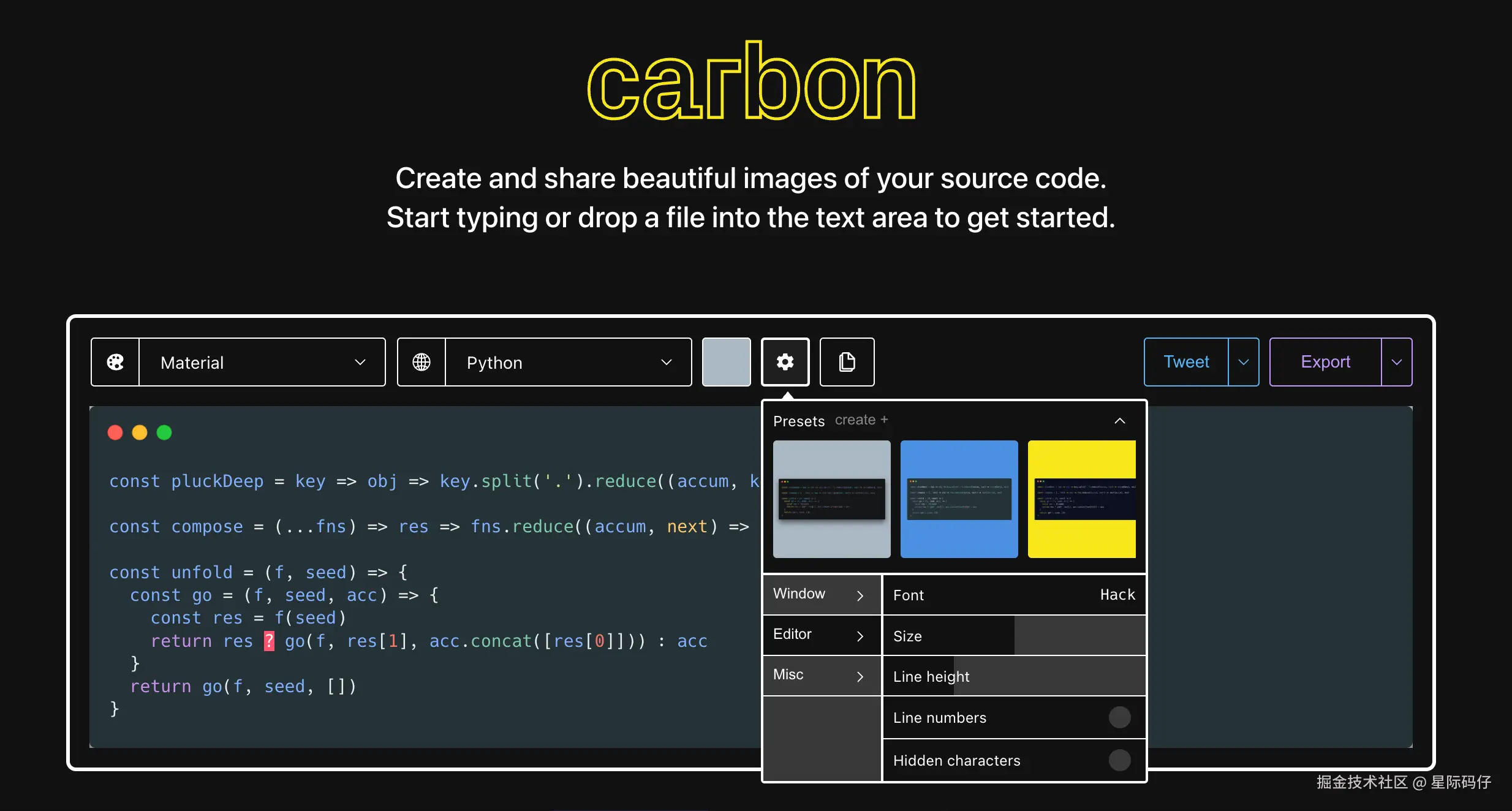 于是,有那么一批注重审美的程序员站了出来,开发了如 Carbon、CodePNG 等在线工具,让代码也能“高颜值”地呈现。
