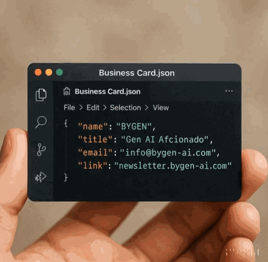 A close-up shot of a hand holding a business card designed to look like a {file_format} file open in {code_editor}. The card shows code formatted in {syntax_type} with keys like {key1}, {key2}, {key3}, and {key4}. The window includes typical toolbar icons and a title bar labeled {file_name}, styled exactly like the interface of {code_editor}. Background is slightly blurred, keeping the focus on the card.