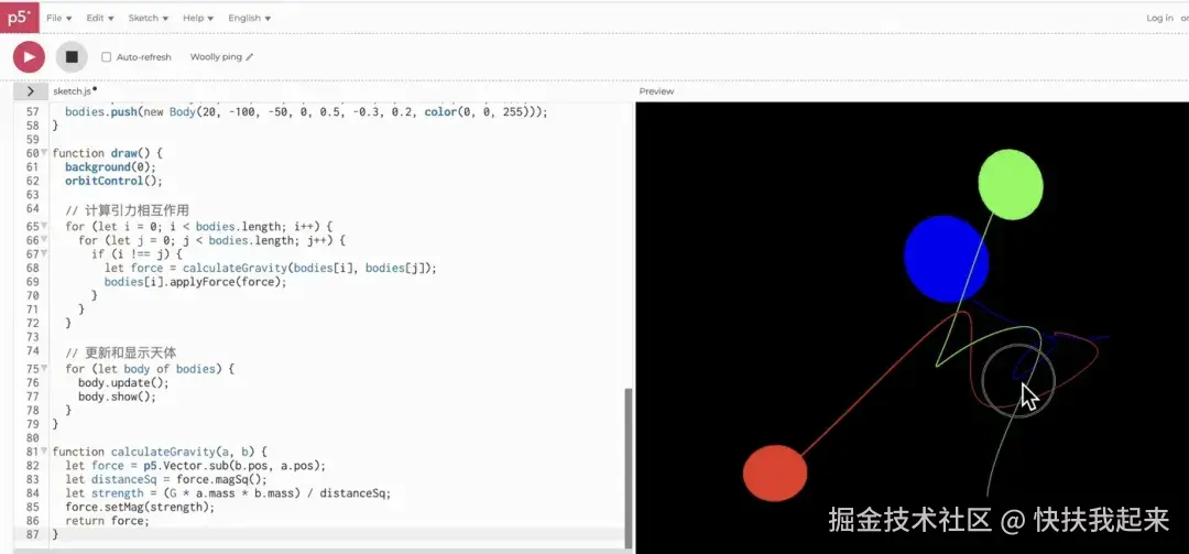 通义灵码新上线的【AI程序员】功能,接入了阿里扛把子通义大模型 Qwen2.5 和DeepSeek-V3,几秒钟就可以对多个代码文件,自动增删改查。比如想可视化三体运动,AI程序员帮忙写出 js 和 html 代码,有一种三日凌空的随机和绚烂。帮忙写一个P5.js代码,实现三体运动的3D可视化,三个天体受到彼此万有引力的吸引,进而运动,并绘制出每个天体的轨迹。