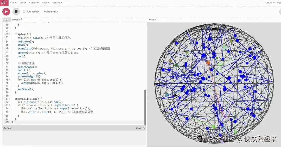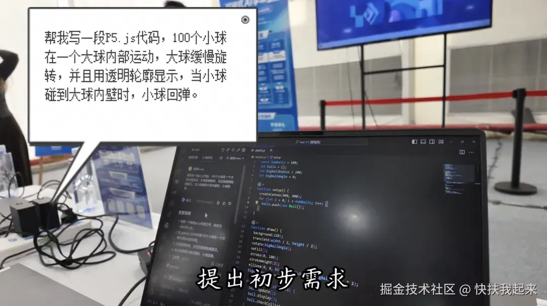 子豪和现场观众昊男一起,给AI上个强度,实现【100个小球在大球里碰撞反弹的3D】效果。
