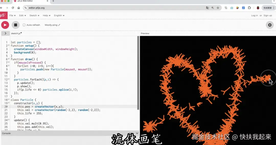 AI瞬间生成出磁吸粒子风、流体画笔、流体波纹、声音可视化、互动分形树、火花爆炸的粒子特效。