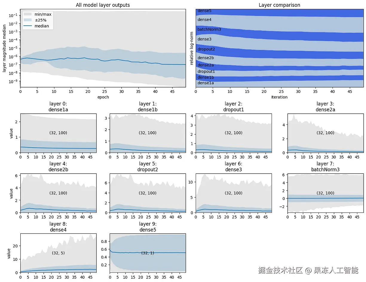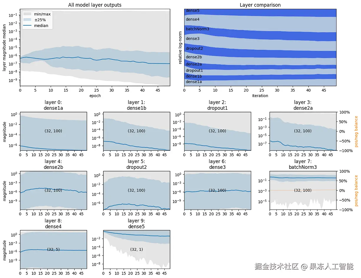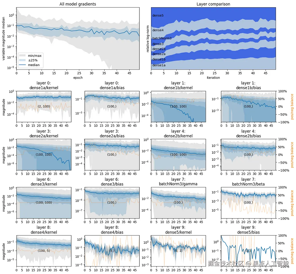 但对于梯度来说,对数量级分布是必须的。因为它能更好地处理梯度那种天生就跨度巨大的情况。你既能看全梯度的变化范围,又能发现梯度是不是小到几乎没用了。上面那个梯度图显示了 9 个百分位 —— 从 0 到 100% 均匀划分,每个间隔 12.5%。注意那个深蓝色阴影,在大约第 18 个 epoch 时掉到底部,说明有 37.5% 的梯度已经变成 0 了。而到了第 47 个 epoch,有 50% 的梯度为 0。这可能是在提示你出了问题。