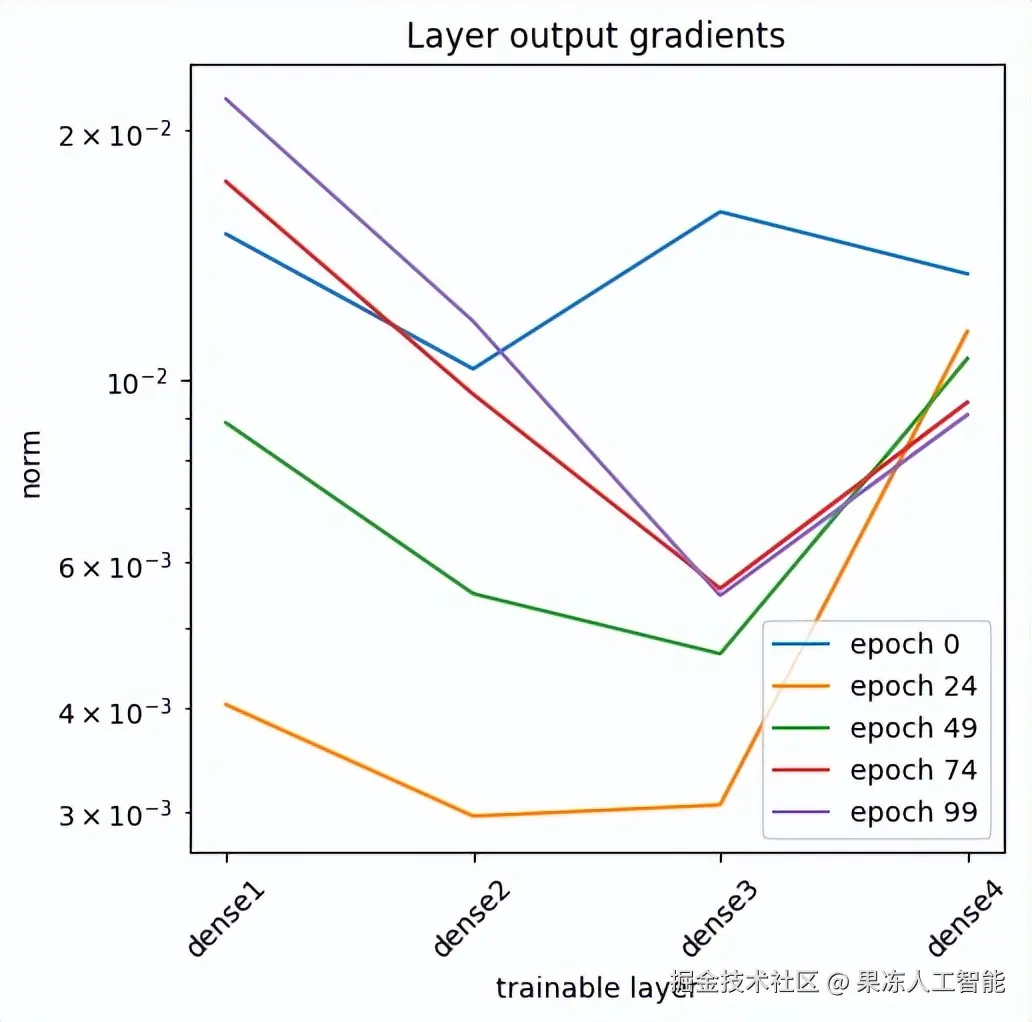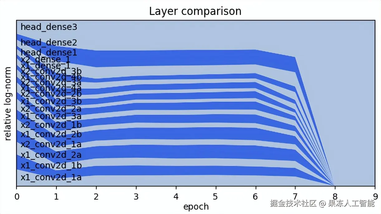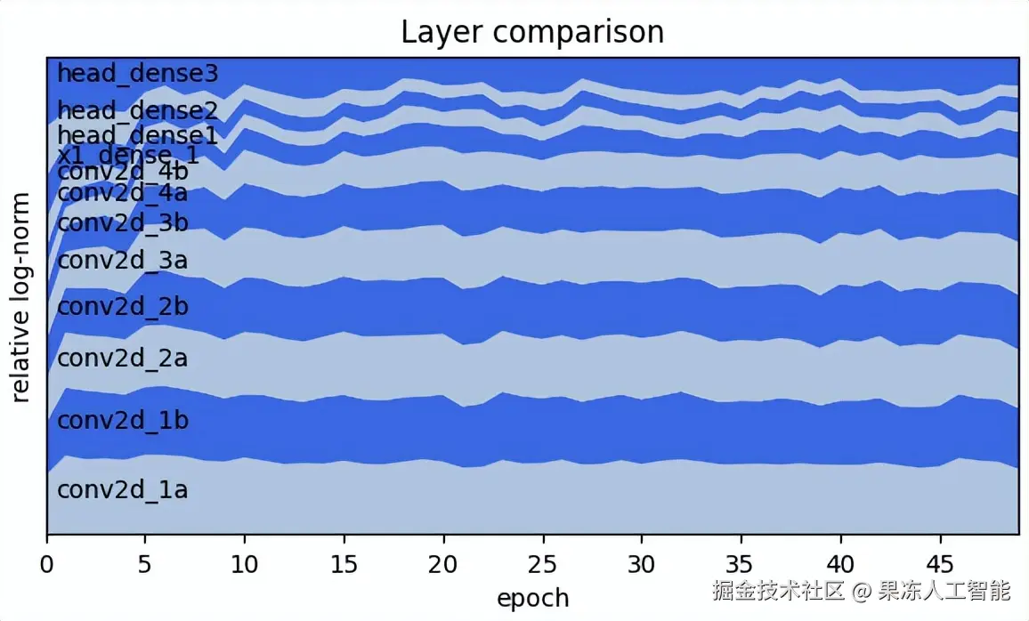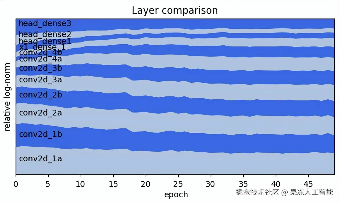 但对于梯度来说,对数量级分布是必须的。因为它能更好地处理梯度那种天生就跨度巨大的情况。你既能看全梯度的变化范围,又能发现梯度是不是小到几乎没用了。上面那个梯度图显示了 9 个百分位 —— 从 0 到 100% 均匀划分,每个间隔 12.5%。注意那个深蓝色阴影,在大约第 18 个 epoch 时掉到底部,说明有 37.5% 的梯度已经变成 0 了。而到了第 47 个 epoch,有 50% 的梯度为 0。这可能是在提示你出了问题。