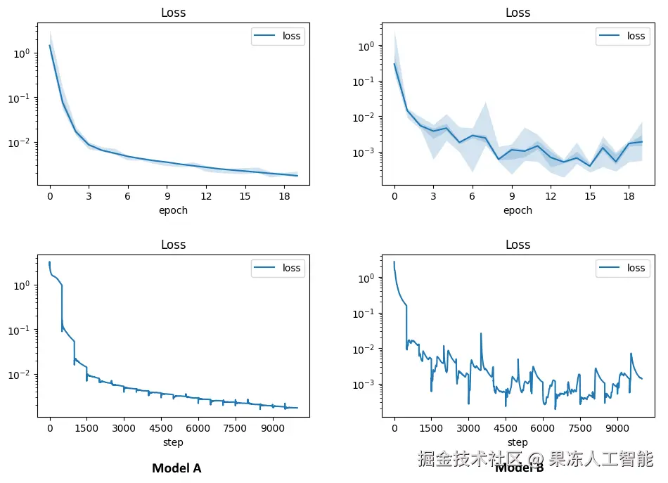 现在差别一下子就大了。Model B 出现了梯度震荡的迹象。其实也不奇怪,因为真相是:这两个模型其实是一样的,唯一的区别是 Model A 的学习率合适,而 Model B 的学习率稍微大了一点点——不至于一开始就出问题,但靠近最优点时就崩了。