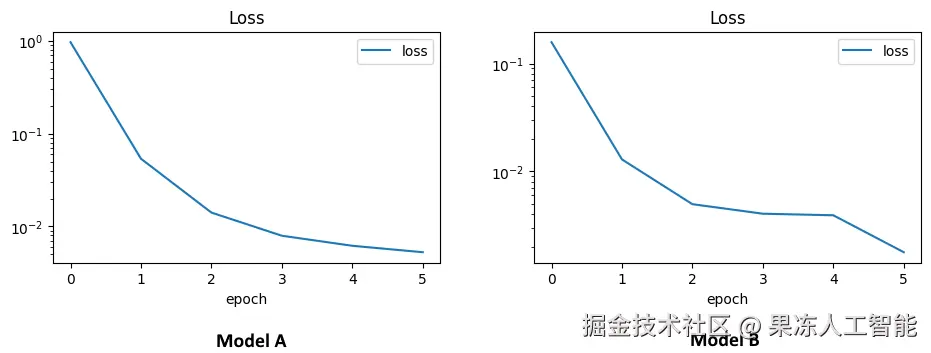你看起来会觉得两个模型训练得都还行,几乎没啥差别。甚至我还可能猜 Model B 比 A 更好点。现在只训练了6轮确实有点假设性强,但这类教训在实际场景里也适用。我们来看它们训练久一点后的结果: