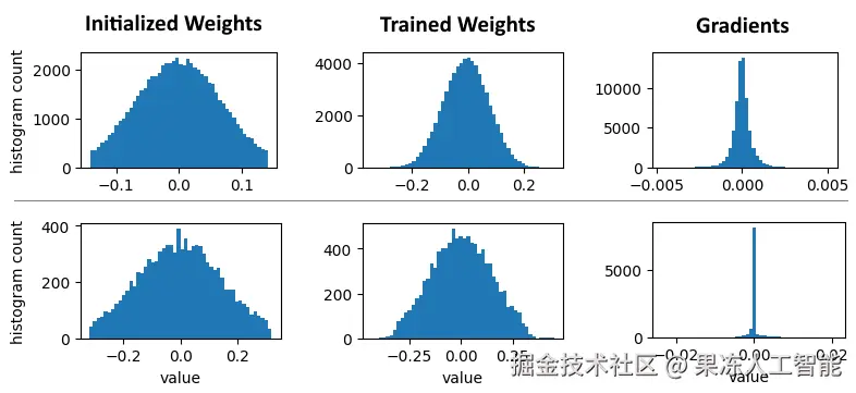 一旦你想用直方图来可视化梯度,就容易出问题。下面是来自两个不同模型的两个代表性层的权重和梯度分布图。最左边是初始化后(用 He-normal 初始化)的权重分布,中间是训练结束时的权重分布,最右边是训练结束时的梯度分布: