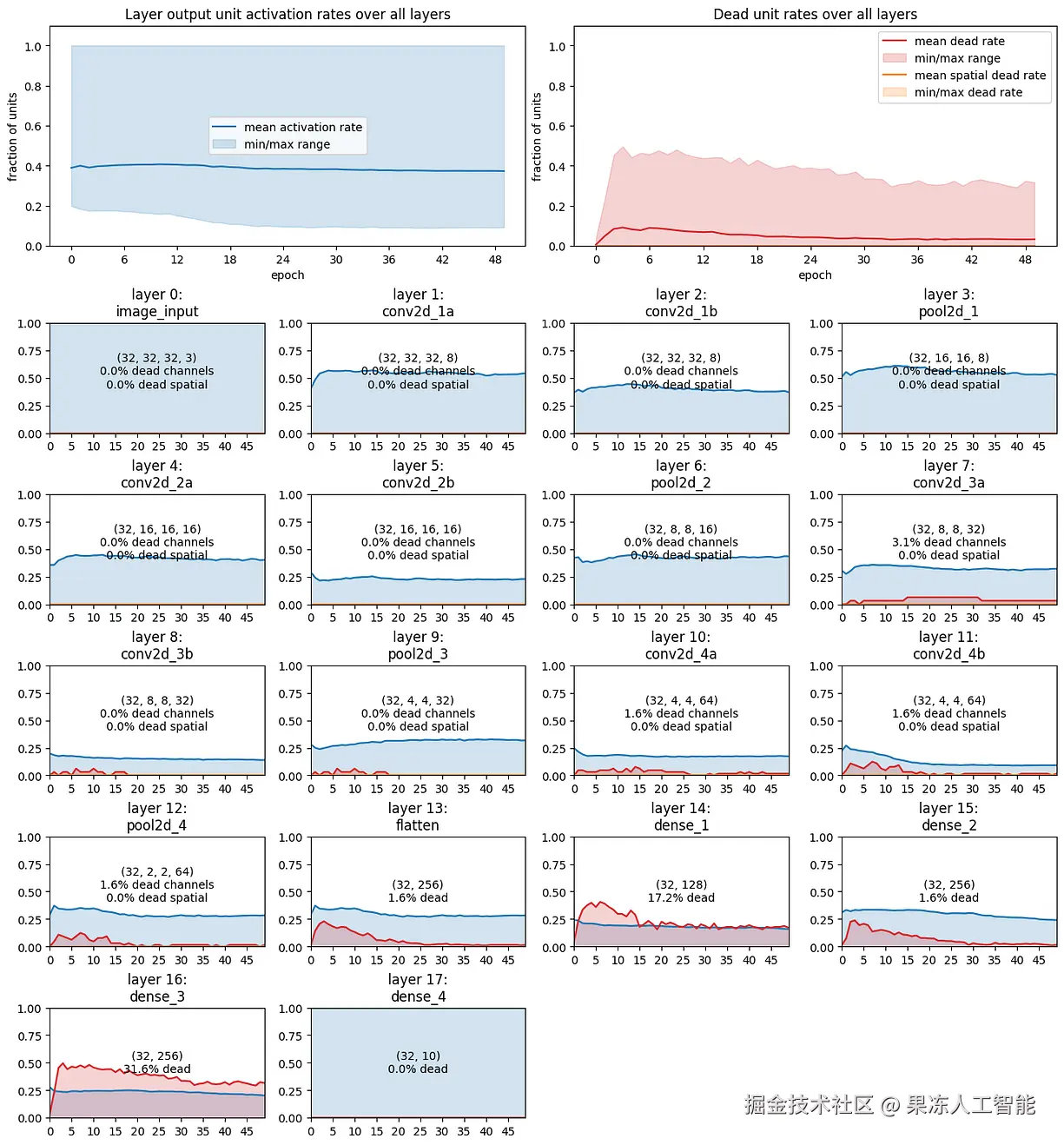 - 右列:激活率和死亡率总览。显示的是激活率的平均/最小/最大值分布,还有最严重的死亡率。这个图的理念是“模型只如其最弱的一层”,所以最坏的要画出来。