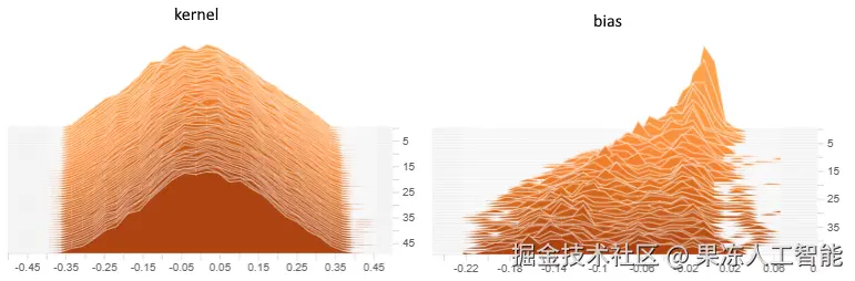 一种很常见的可视化权重和偏置的方式,是把多个直方图叠在一起,形成一个 3D 的层叠图。越旧的状态排在后面,越新的排在前面: