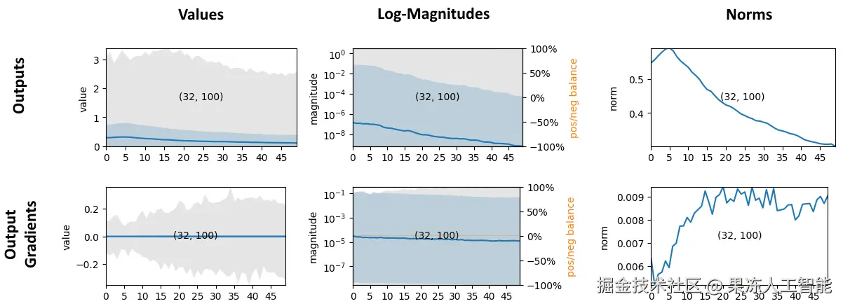 - 中列:各层尺度的 log 相对图,适合判断梯度消失或爆炸。它只显示层之间的相对尺度,不管全局趋势。