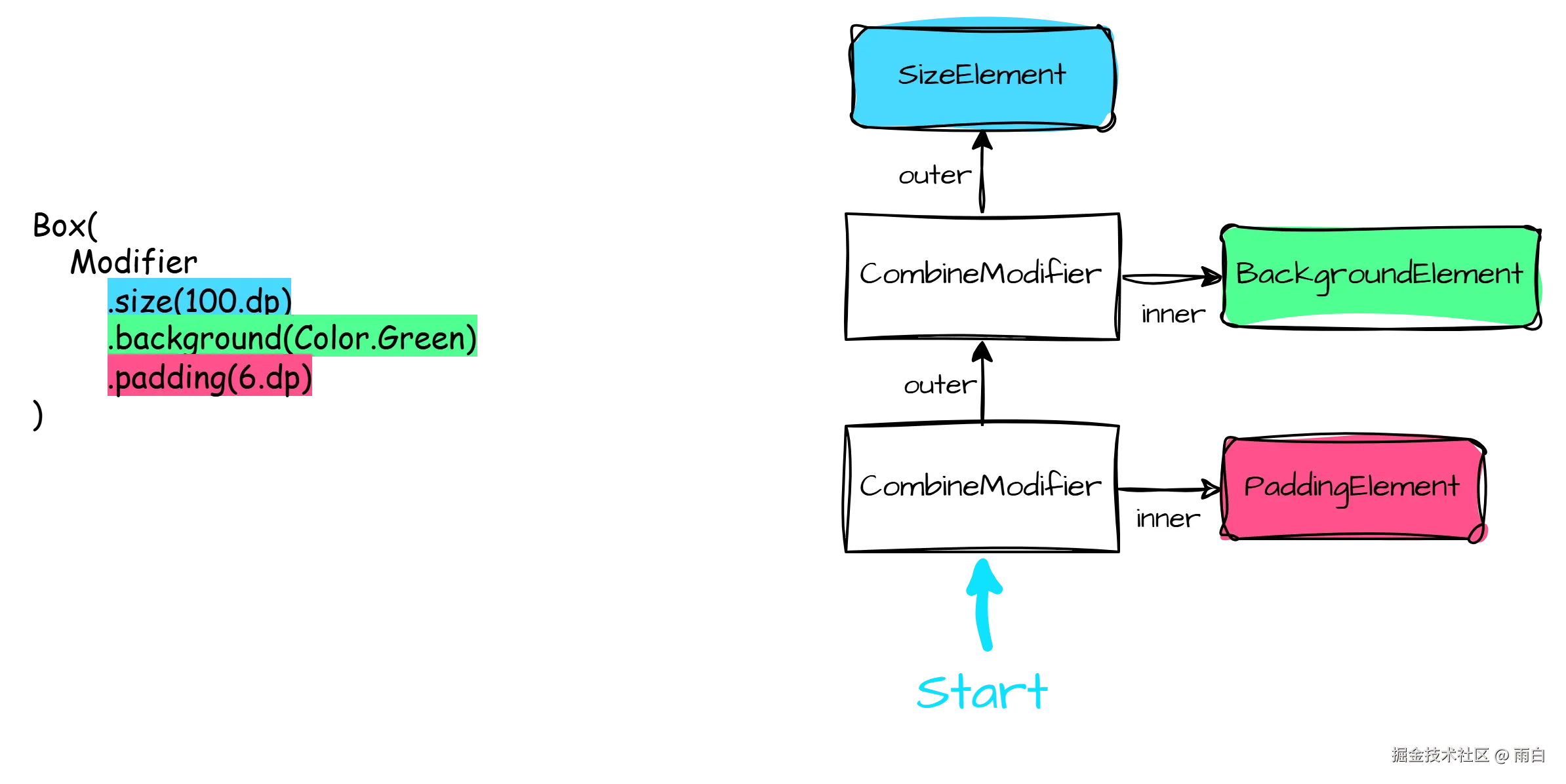 这样,通过嵌套的 CombinedModifier 对象,我们就形成了一个完整的 Modifier 链,如图所示。每个 CombinedModifier 都包含了之前所有修饰符的信息,同时保持了它们的应用顺序。