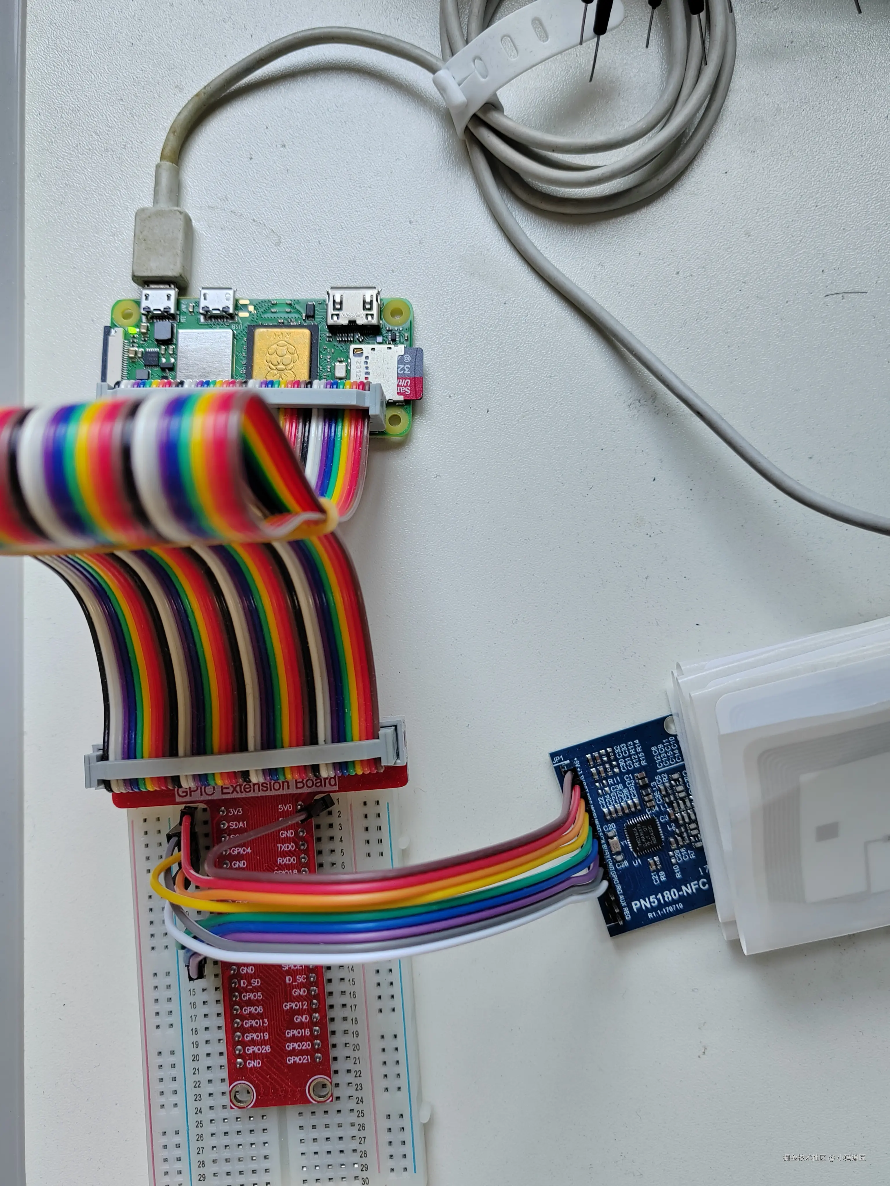 杜邦线用于连接 Raspberry Pi Zero 2 W 和 PN5180 模块。GPIO扩展板会标注逻辑引脚,配合面包板使用,方便连接多种传感器。
