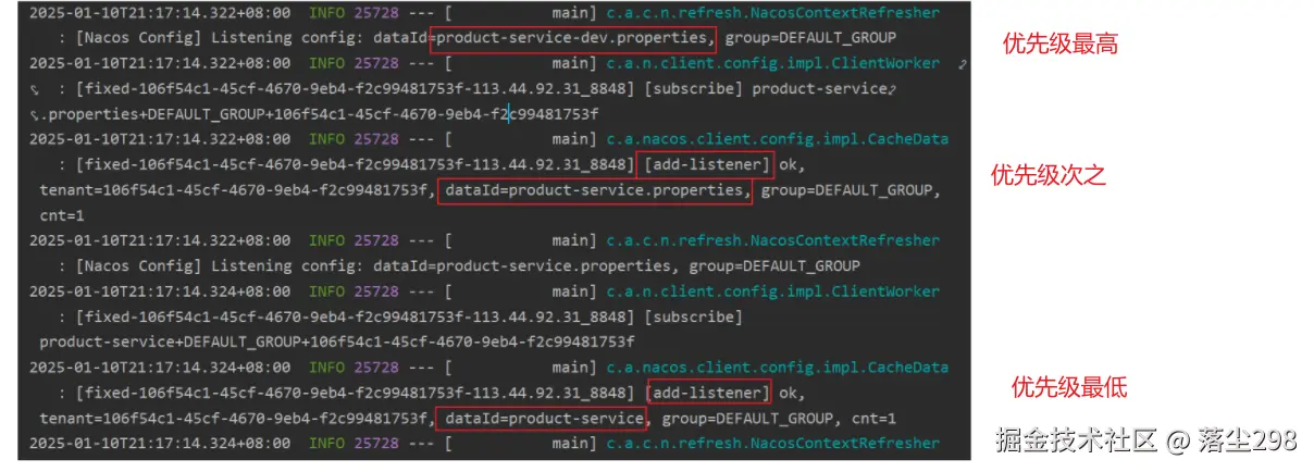 在日志中可以看出是监听了三个类型的文件配置,如果这三个类型配置都配置上的话它们的一个优先级如下;