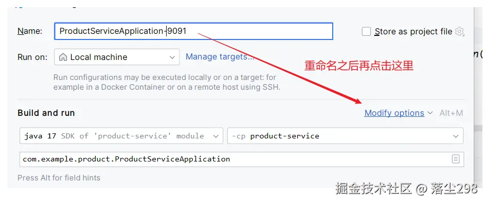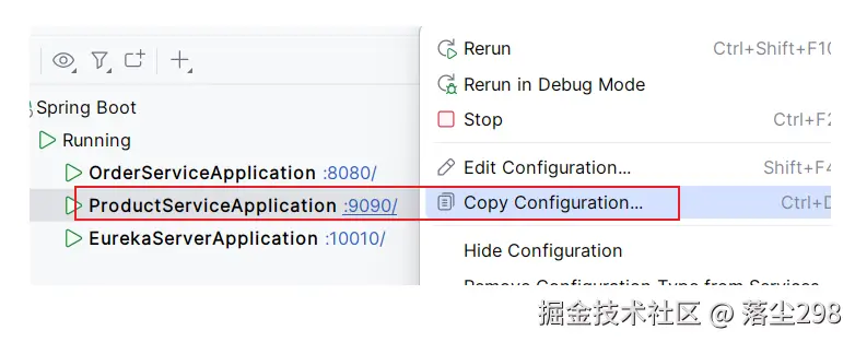 在上面的远程调用的代码中是根据应用名称获取到了服务实例列表,从列表中选择了一个服务实例,如果说一个服务对应多个实例该怎么分配呢,例如上面的 product-service 配置的是 9090 端口号,如果再想开启一个product-service 的服务,那么就需要把原来的服务停止掉再开启,接下来演示一下不修改代码的条件下如何开启多个服务: