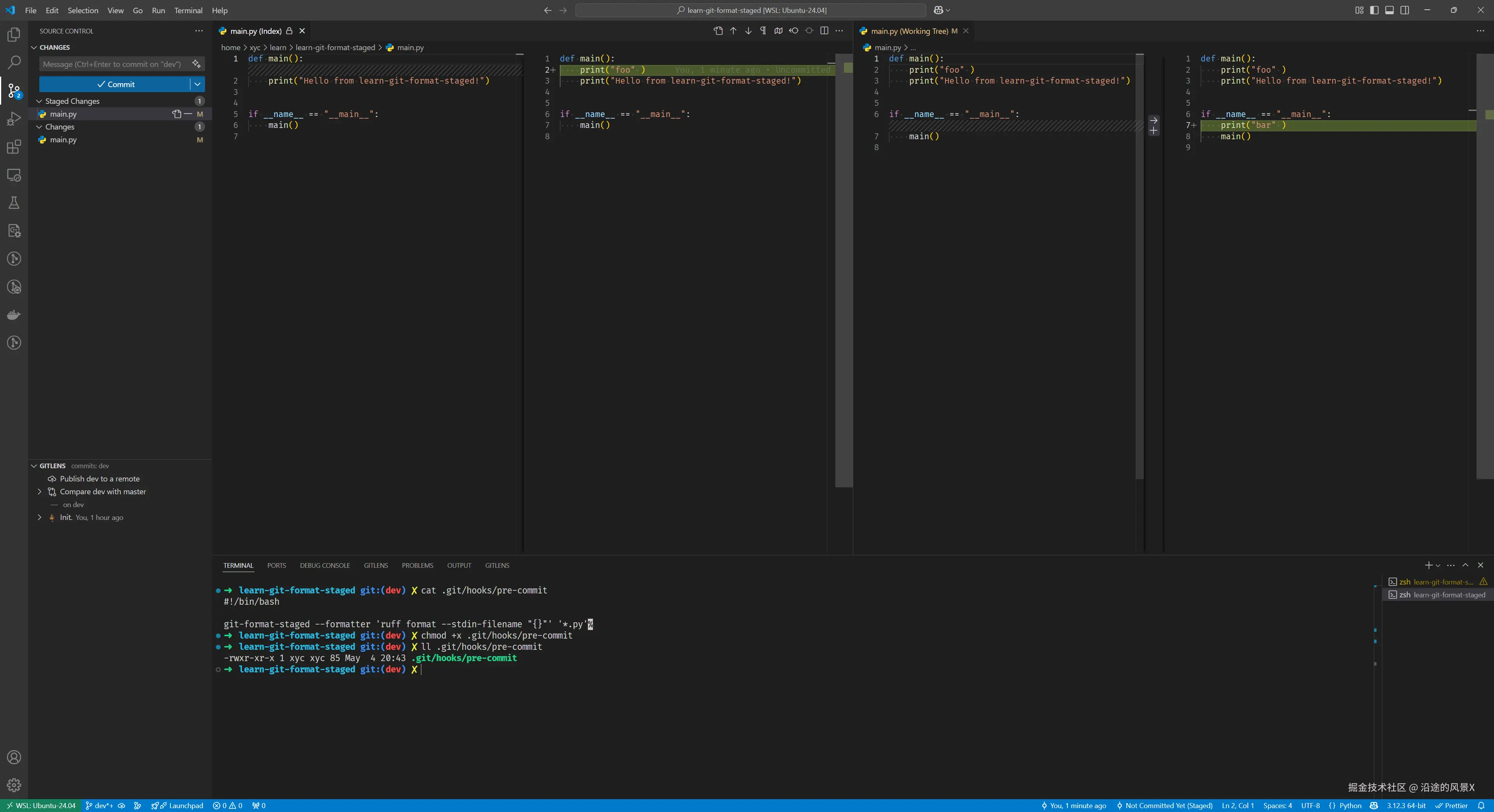 简单试了一下发现这个方案有个问题:如果代码格式有误,例如少了括号,formatter(例如ruff)会报错,无法格式化。而git-format-staged这个方案,只要保证add到index的内容的格式无误即可。
