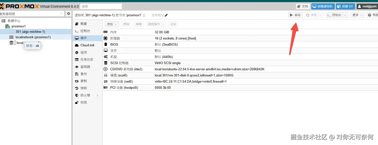 注意,由于proxmox reboot操作过,并且我的vm实例不是开机自启动,这里可以操作后直接启动,如果是正在运行中的实例,请关闭实例后启动.