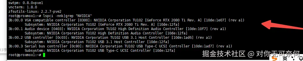 正常直通时,输出应显示内核驱动为 **vfio-pci ****,如果未显示则需要执行 **验证并配置VFIO部分。