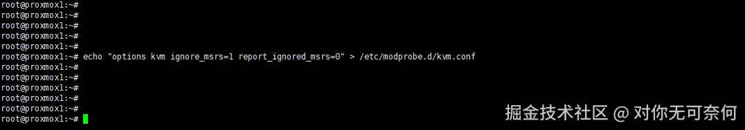 echo "options kvm ignore_msrs=1 report_ignored_msrs=0" > /etc/modprobe.d/kvm.conf