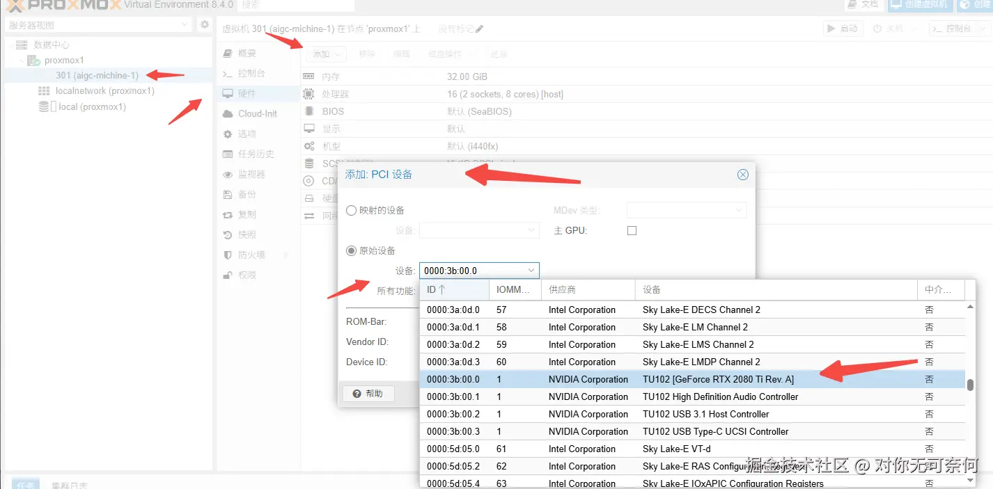 以VM实例301为例:点击vm 实例-硬件-添加-PCI设备-原始设备,找到2080TI设备选中,添加: