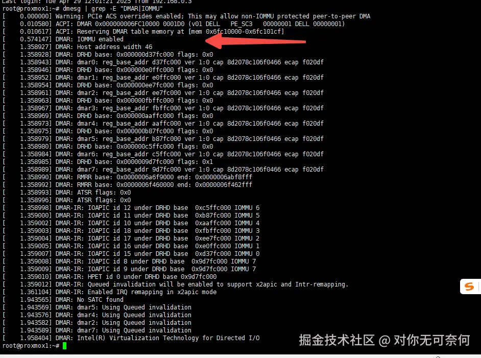 待服务器启动后,登录服务器验证IOMMU是否启用: