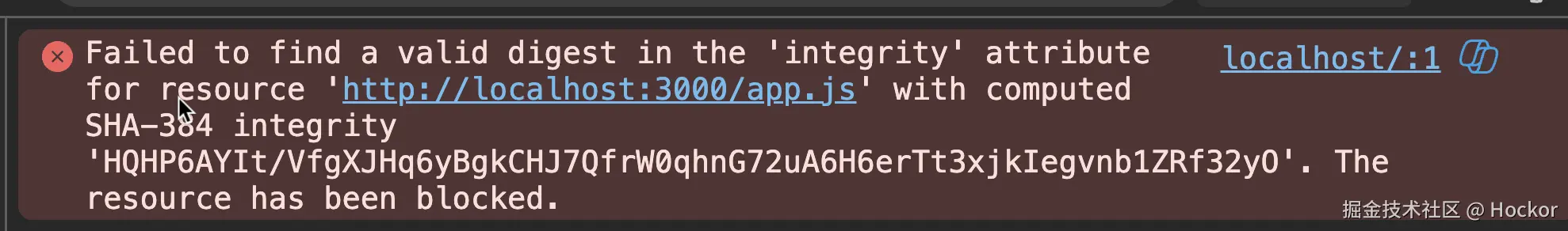 如果 JS 代码有被篡改,那么控制台就会报错如下,并且 JS 不会被执行