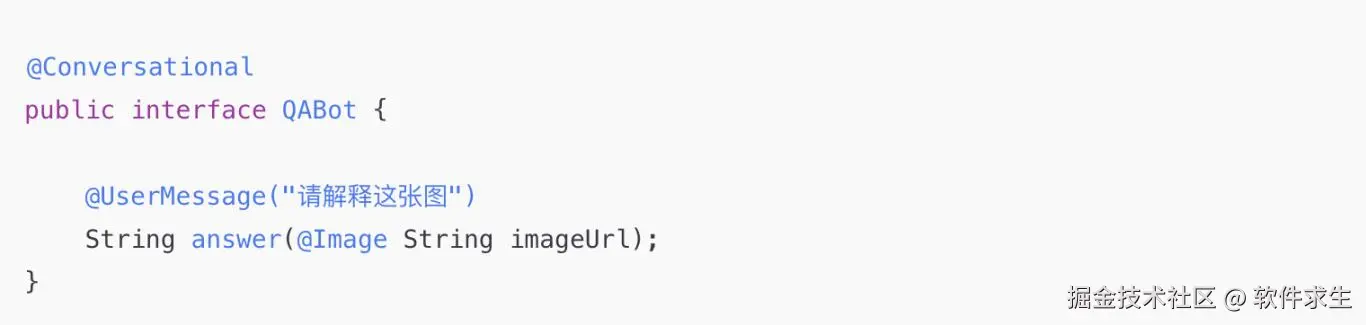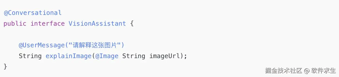 是不是很像 Spring 的 @RequestMapping?LangChain4j 的 @UserMessage 就是 Prompt,@Image 就是告诉模型“这个参数是图片”。