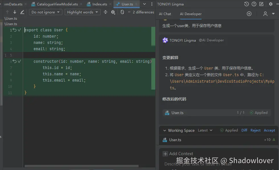 DevEco Studio 的通义灵码安装方法很简单,它是基于 IntelliJ IDEA 进行二次开发的 IDE,安装步骤和 IDEA 很类似, 可以参考 IntelliJ IDEA 中安装和使用通义灵码 AI 编程助手教程。
