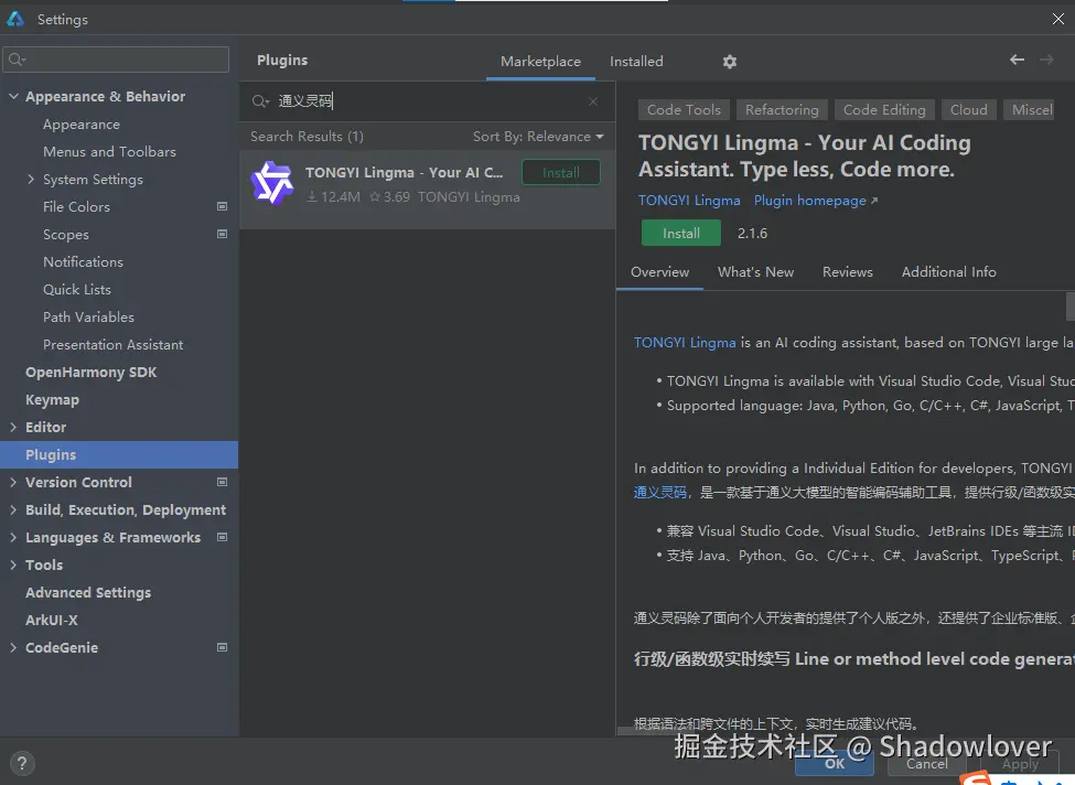 在搜索框中输入 “通义灵码”,找到插件后点击 Install 按钮进行安装。