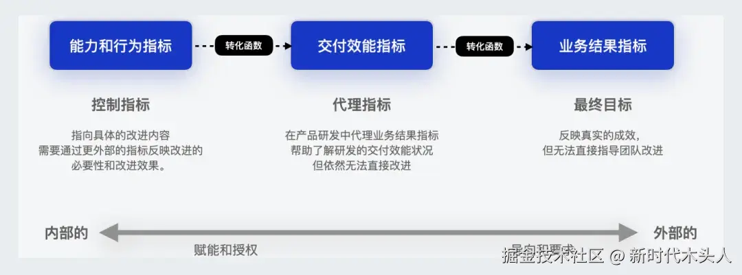 - 交付效能指标: 反映技术团队的效率,与业务结果有一定相关性,但不直接影响业务结果。例如,速度、吞吐量和质量等因素。