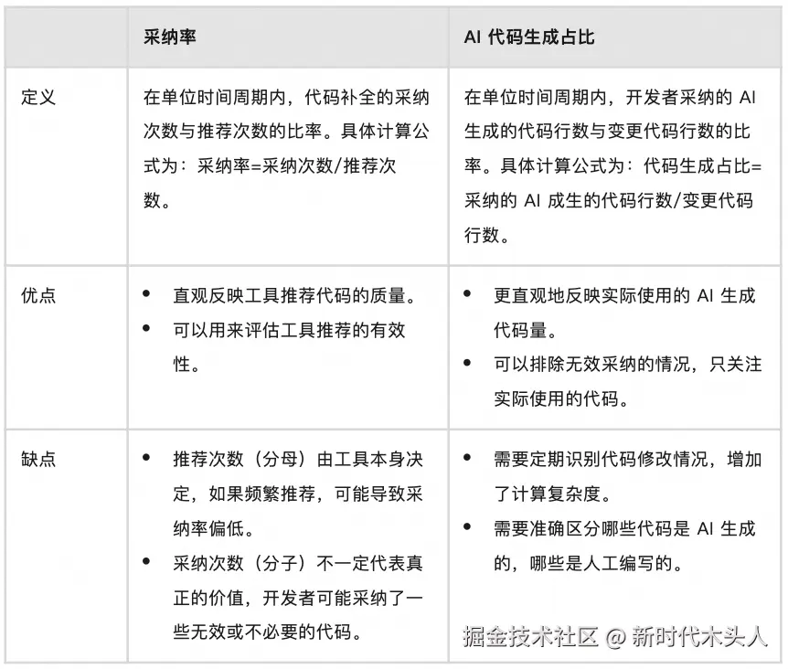 针对 “到底使用采纳率合适,还是 AI 代码生成占比合适” 的问题,首先需要明确两者的定义及其计算逻辑: