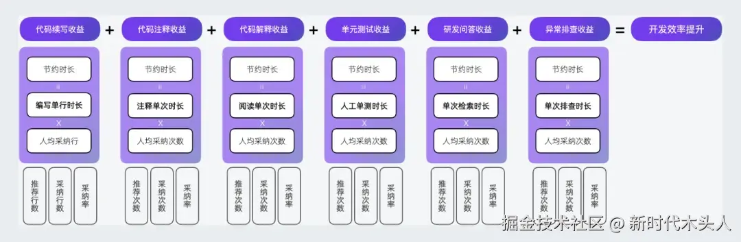 - 开发效率提升: 通过观测开发者在使用 AI 编码工具前后的编码效率变化,建立相关性。同时,通过 “工具使用的行为 x 效果 ≈ 效率” 这个简单公式,来获得对于个人开发效率提升的统计。