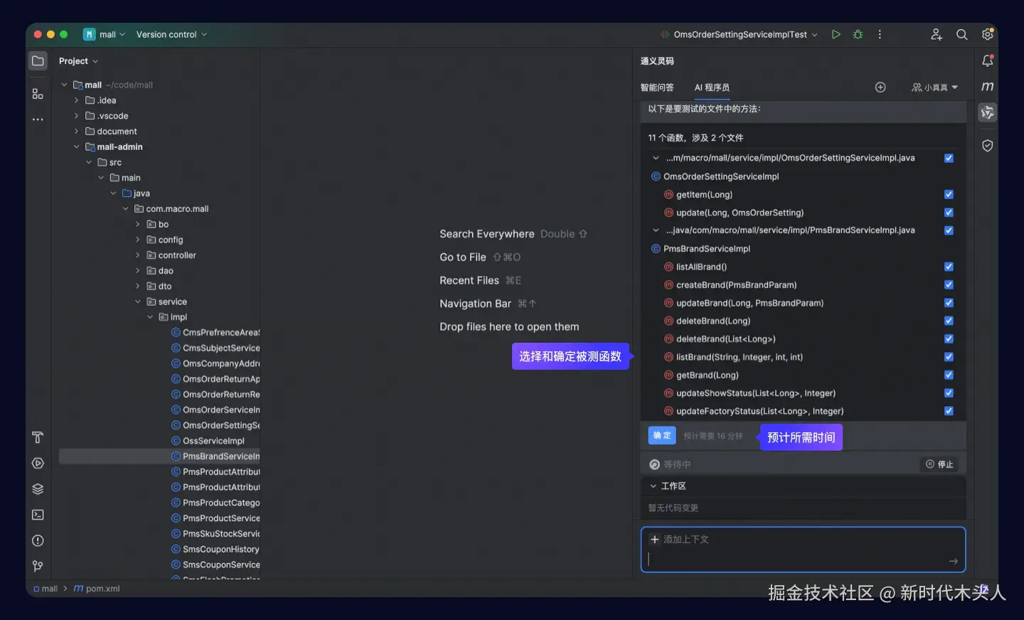 环境信息检查通过后,AI 程序员将自动分析被测文件,并生成测试计划,开发者可以主动选择需要覆盖的方法,选择并确认完成后,单击确定按钮,即可开始为每个方法生成单元测试用例。