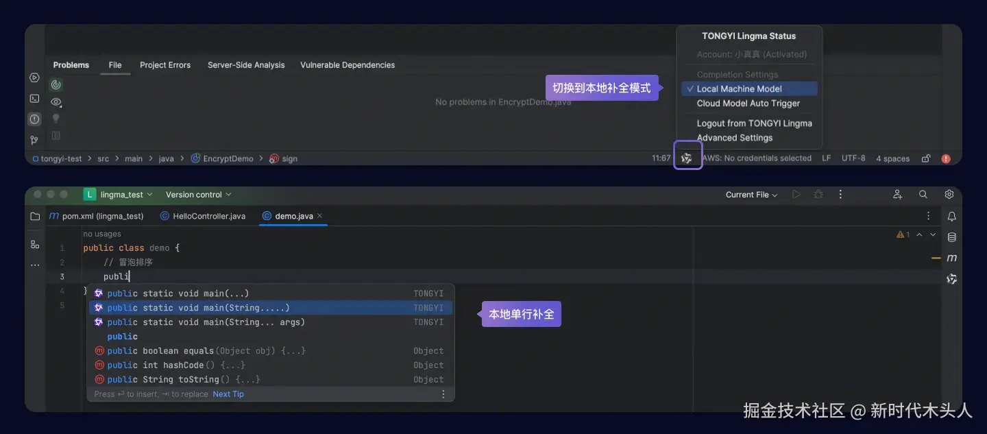 开启本地离线模型、云端大模型同时开启的情况下,行间生成时优先推荐云端大模型的代码建议;