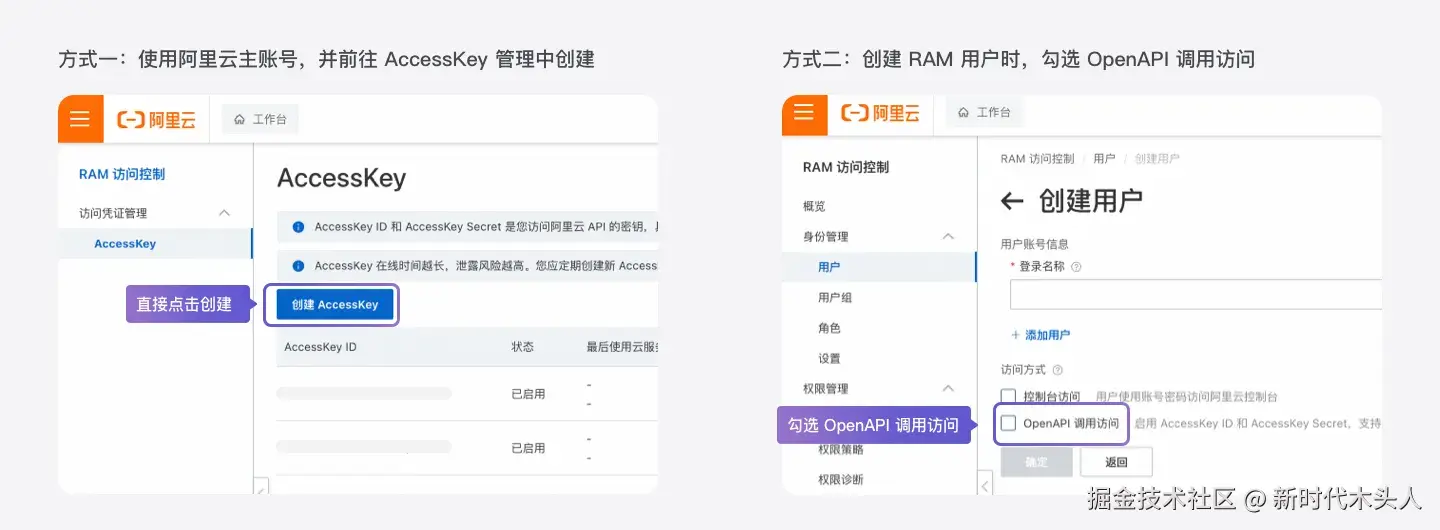 1 前往阿里云控制台获取 AccessKey,具体操作可参考:创建 AccessKey 。