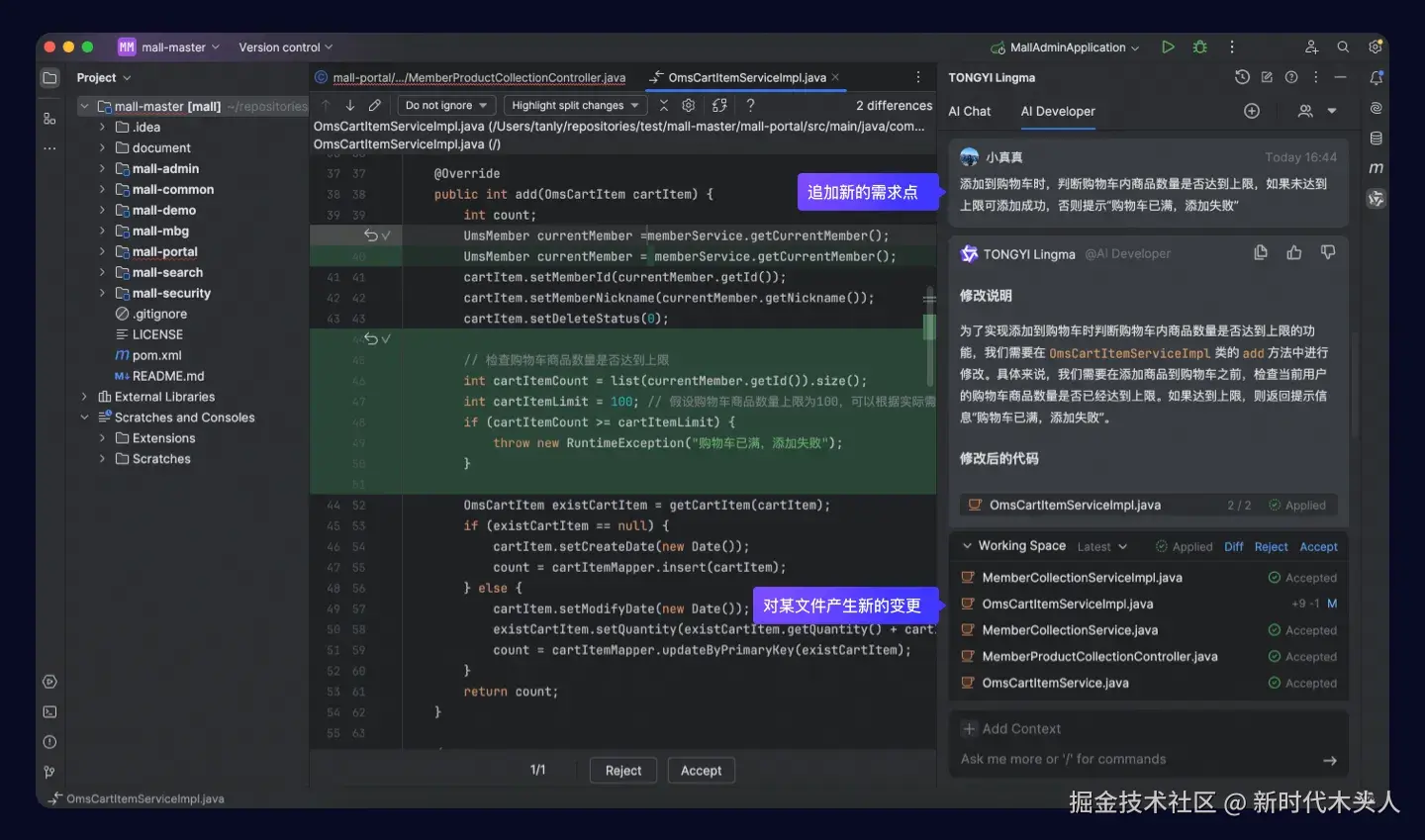 审查和修改变更: AI 程序员完成多个文件的代码变更后,开发者可以通过变更对比查看视图(Diff View)进行审查,以及对局部代码片段进行接受、拒绝、修改,保证最后得到符合预期的代码变更。