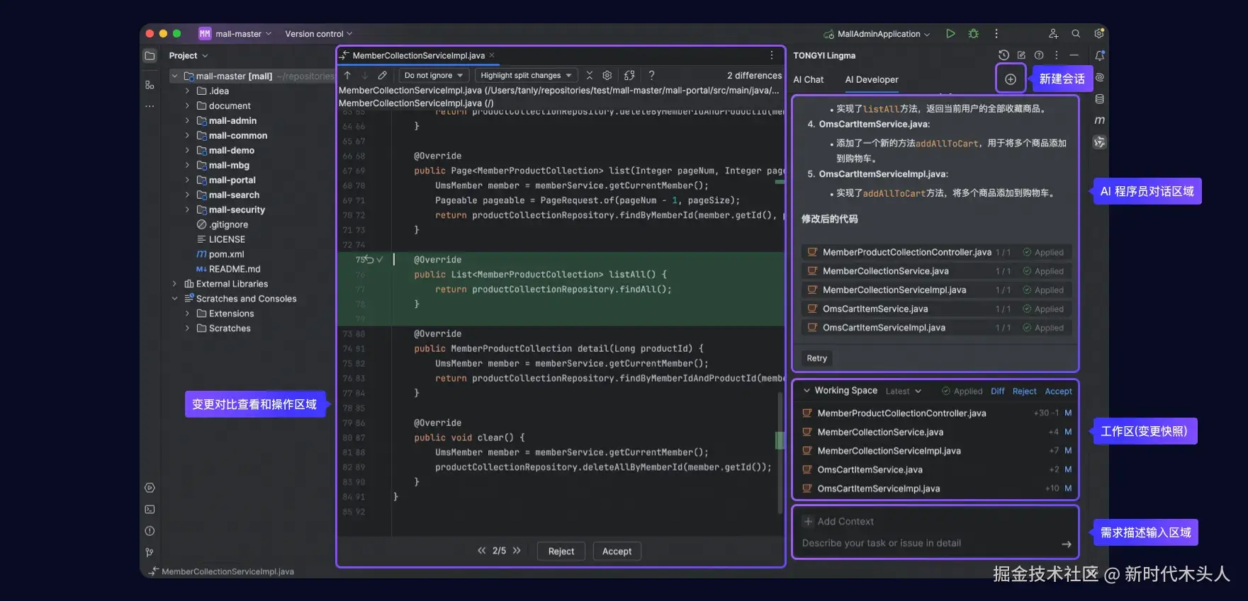 ** 工作区 :** 承载代码变更文件的展示,以及针对当前会话流中的多次对话产生的多次变更文件进行快照管理,同时提供查看、拒绝、接受代码变更的相关操作入口;