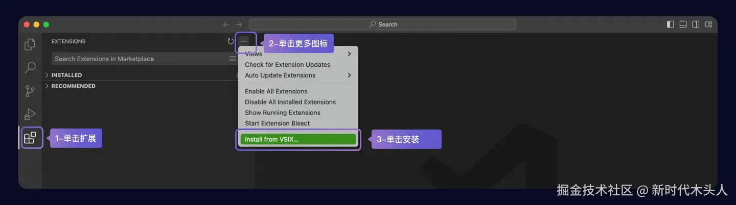 下载完安装包后,打开 Visual Studio Code 后,单击扩展,单击更多按钮,在下拉菜单中单击 从 VSIX 安装,选择下载的 VSIX 文件后安装;
