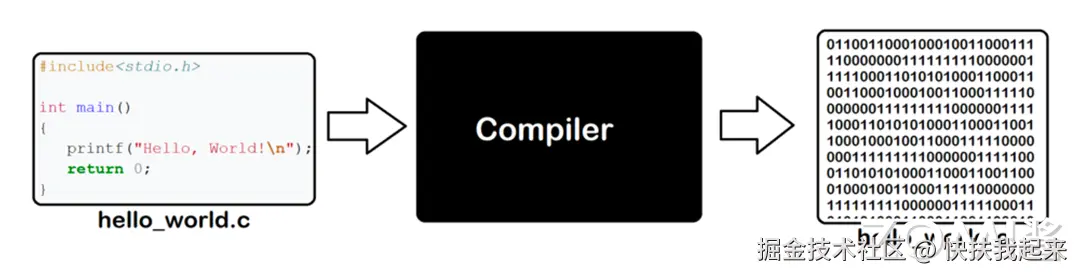 - 编译器读取源程序代码,输出可执行机器码,即把开发者编写的代码转换成 CPU 等硬件能理解的格式