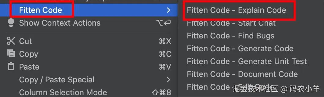 要使用代码解释功能,只需要选中需要解释的代码,然后右键选中「Fitten Code」->「Explain Code」即可解释代码,如下图所示。