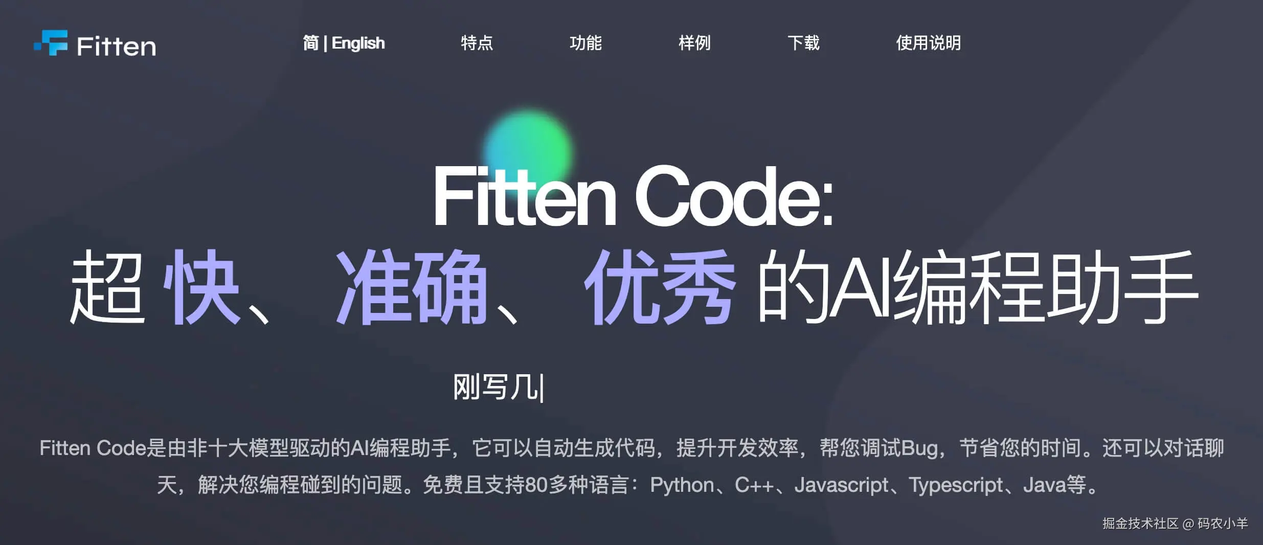 Fitten Code 旨在帮助程序员提高代码开发效率以及代码质量,它可以自动生成代码,提升开发效率,帮您调试 Bug,节省您的时间。还可以对话聊天,解决您编程碰到的问题。免费且支持 80 多种语言:Python、C++、Javascript、Typescript、Java 等。