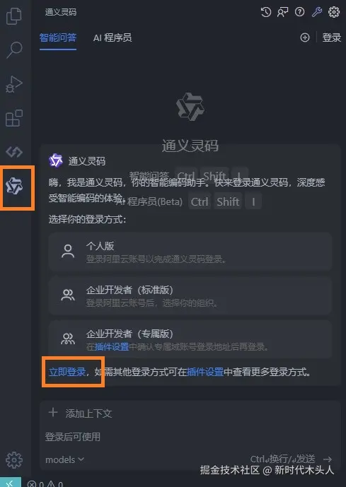 - 安装完成后,VSCode 左侧会新增一个通义灵码的图标,点击即可进入插件界面。