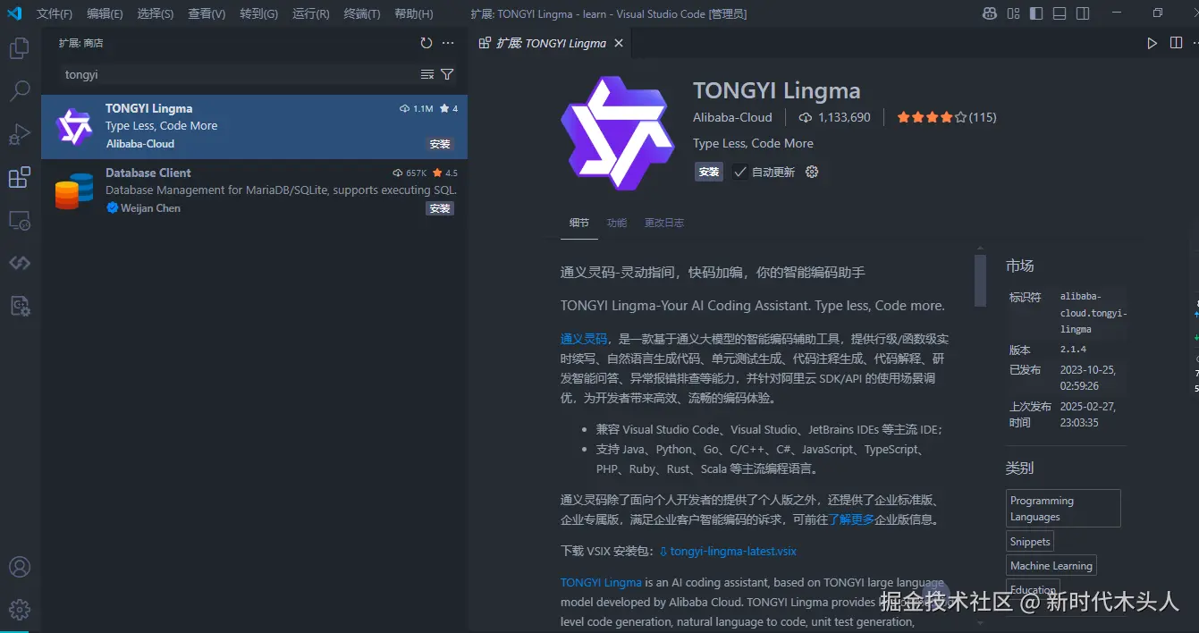 - 点击 “安装” 按钮,VSCode 会自动下载并安装通义灵码插件。