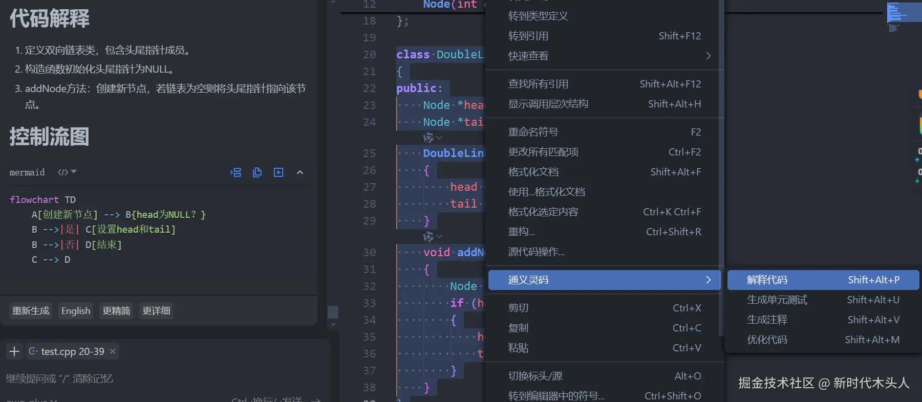 选中代码后,点击通义灵码的代码解释按钮,AI 会根据代码生成对应的解释,帮助开发者深入理解代码的逻辑和原理。