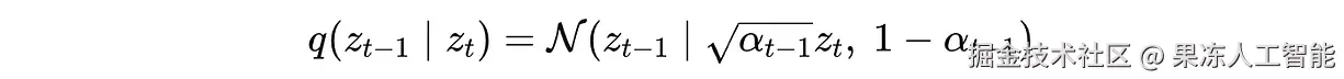 这表示这是一个关于潜变量 z(t-1) 的高斯分布,其中 √α(t-1)⋅ z(t) 是均值,1 — α(t-1) 是方差。