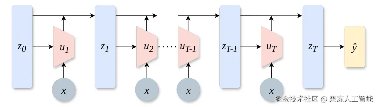 它建模了我们如何从噪声开始,经过一系列步骤,把它去噪到最终表示 z(T) ,然后用这个去预测标签 y。